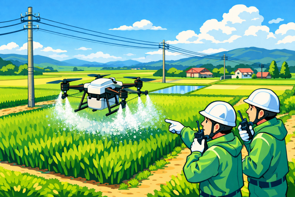 農薬散布においては、農薬取締法に基づく農薬の使用者が遵守すべき基準と、農林水産省の「空中散布ガイドライン」に従い、農薬の飛散(ドリフト)や事故を防ぐ対策を講じる必要があります。