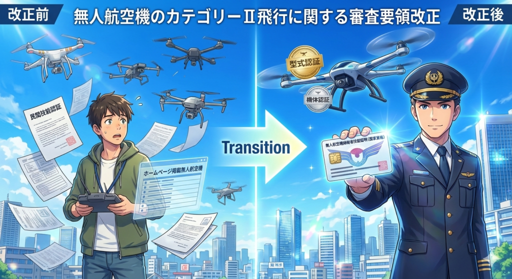 今回の改正は「無人航空機の飛行に関する許可・承認の審査要領(カテゴリーⅡ飛行)」の一部改正であり、これに伴い従来、飛行許可・承認の申請手続について簡略化(省略)を可能としていた運用の見直しが行われます。