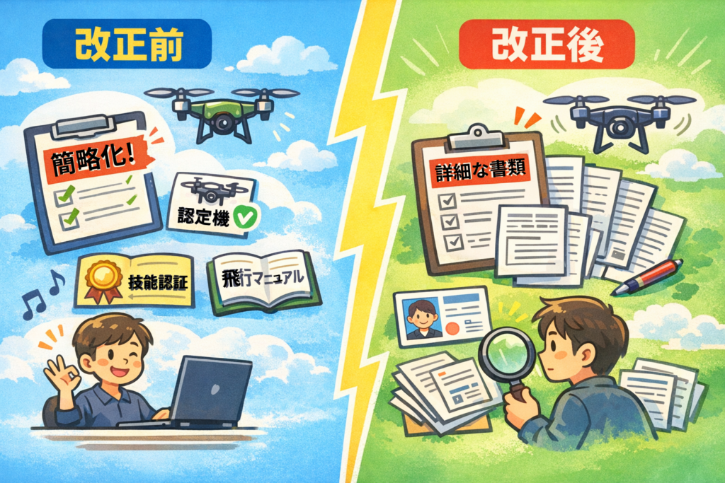つまり、型式認証・機体認証・無人航空機操縦者技能証明など、別の法的に明確な簡略化根拠がある場合を除き、従来より詳細な証明書類や提出や説明を求められる可能性があります。