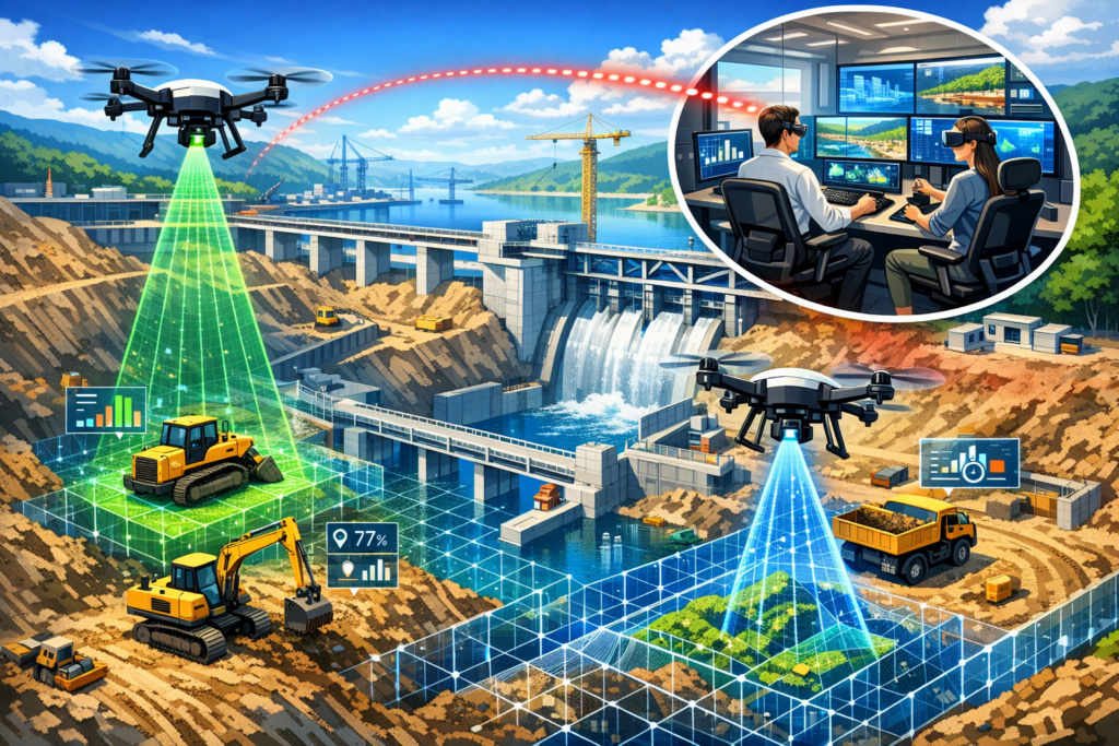 - リアルタイム情報伝送と遠隔管理:ドローンやロボットで撮影された映像や3次元点群データを、高速通信(Starlinkなど)を活用して遠隔拠点(オフィス)へリアルタイムに伝送し、施工進捗や異常を遠隔から迅速に確認することが可能です。
