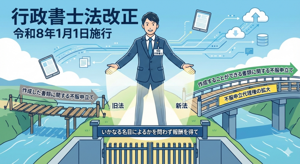 - 改正内容: 不服申立て手続きの代理等ができる範囲が、従来、行政書士が作成した官公署に提出する書類に係る許認可等に関するものから、行政書士が作成することができる官公署に提出する書類に係る許認可等に関するものへと拡大されました。(1条の4)